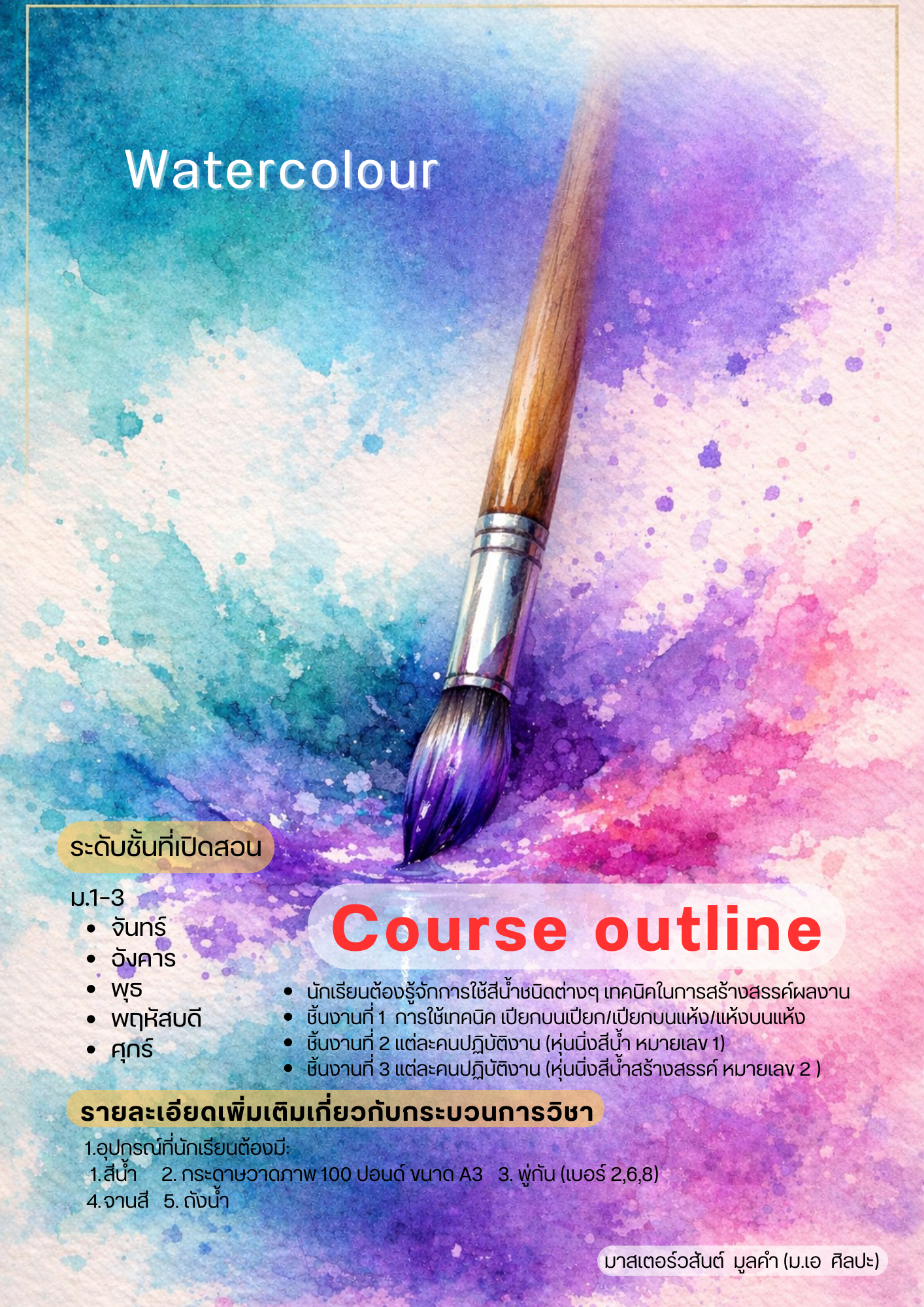 ชื่อวิชา : สีน้ำ ครูผู้สอน : วสันต์ มูลคำ ระดับชั้นที่เปิดสอน : ม.1 ม.2 ม.3 ค่าใช้จ่าย : - ดูรายละเอียดเพิ่มเติม.. |