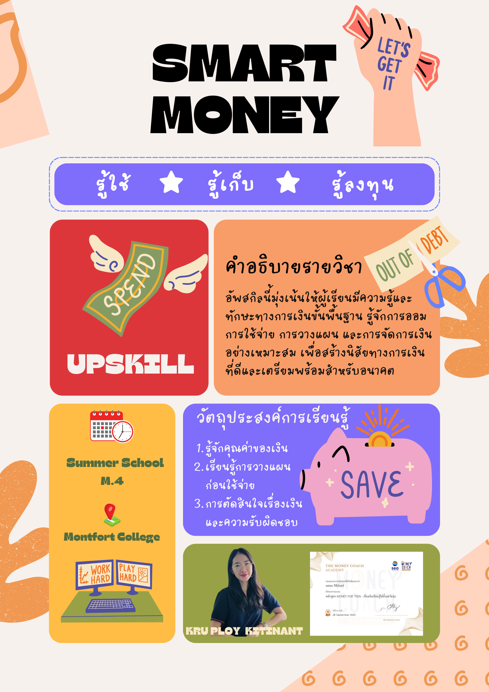 ชื่อวิชา : SMART MONEY ครูผู้สอน : พลอย กิตินันทร์ ระดับชั้นที่เปิดสอน : ม.4 ค่าใช้จ่าย : - ดูรายละเอียดเพิ่มเติม.. |
