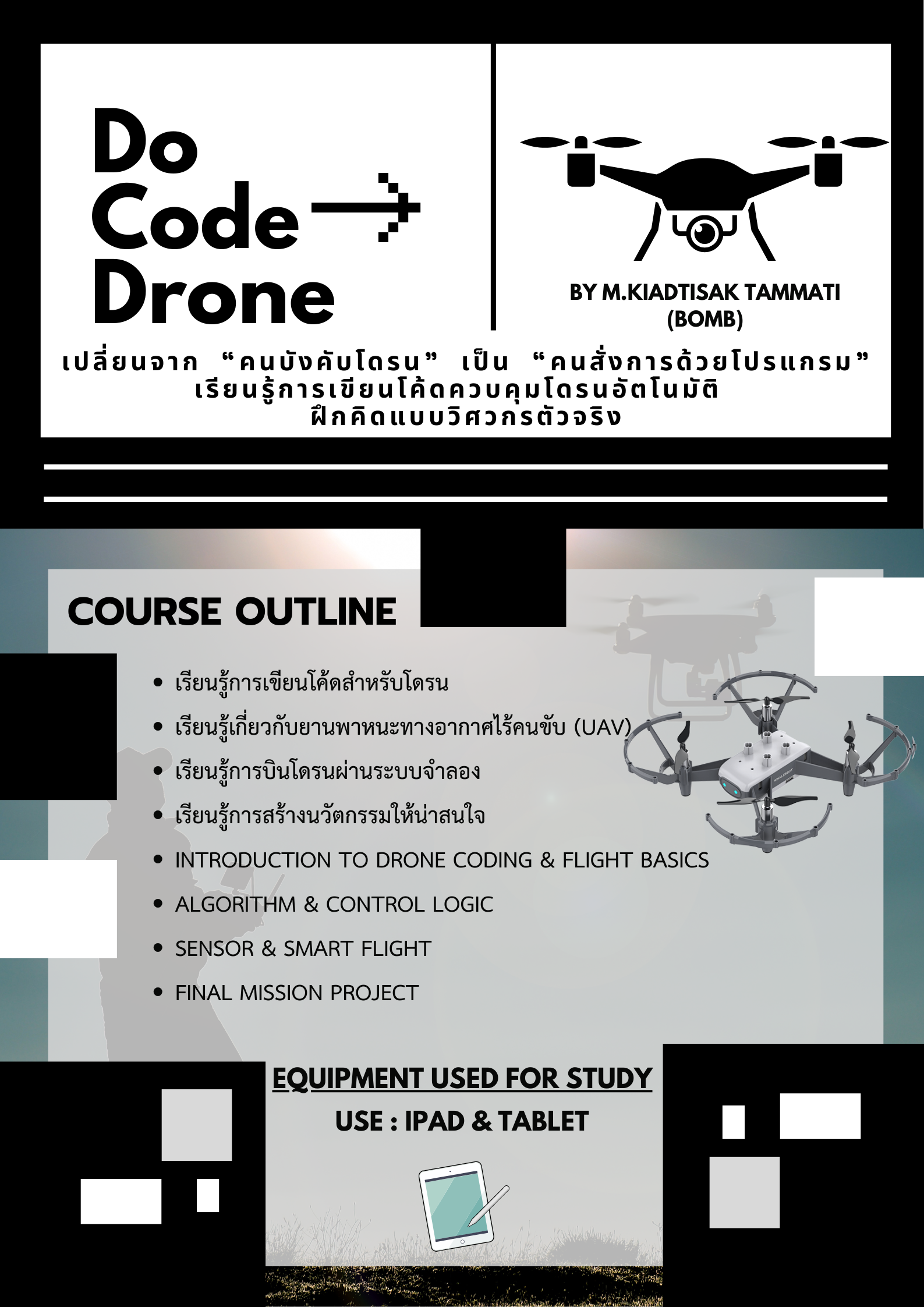 ชื่อวิชา : Do Code Drone ครูผู้สอน : เกียรติศักดิ์ ธรรมธิ ระดับชั้นที่เปิดสอน : ม.2 ค่าใช้จ่าย : - ดูรายละเอียดเพิ่มเติม.. |