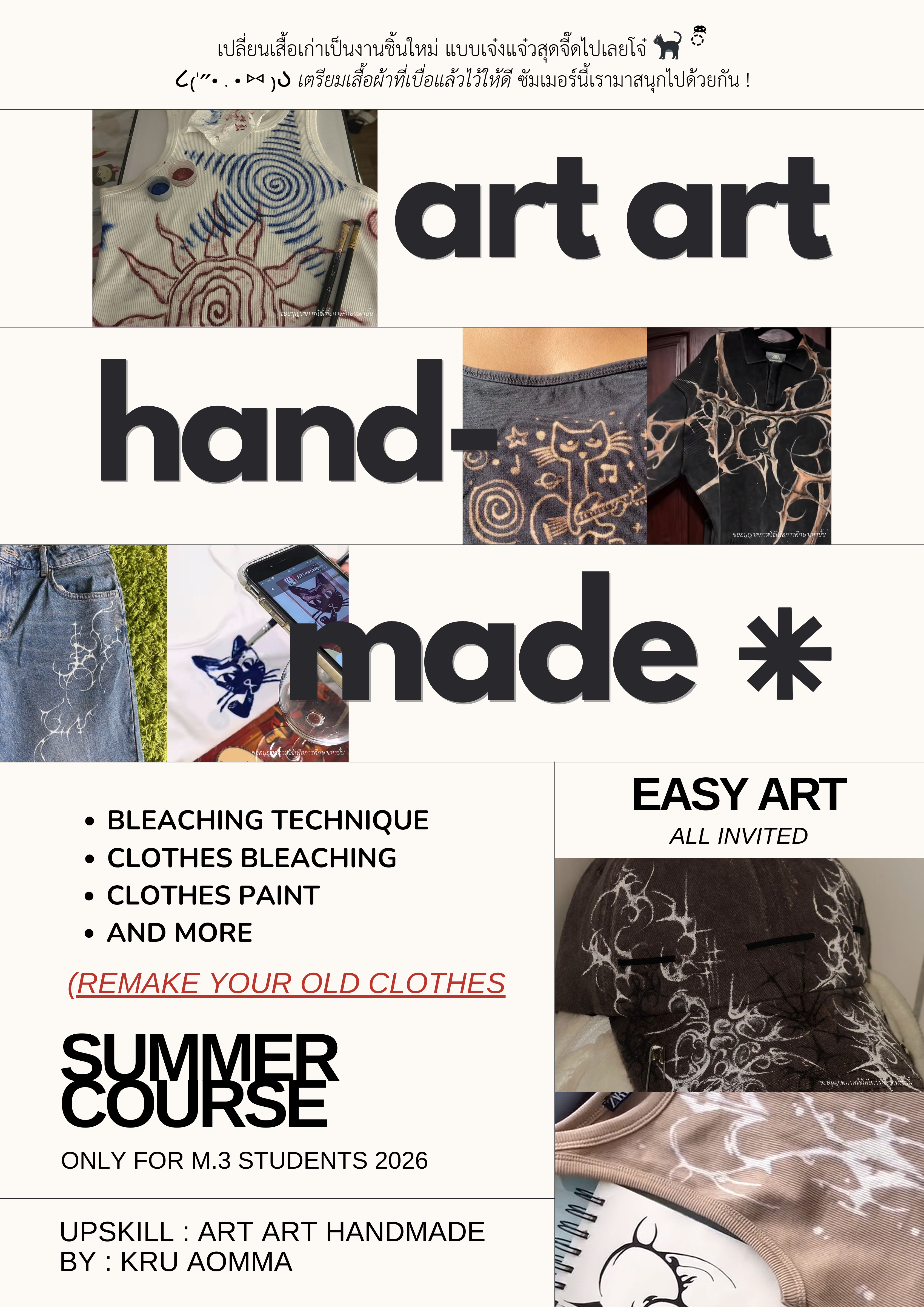 ชื่อวิชา : Art Art Handmade ครูผู้สอน : ธัญรดา หยุมปัญญา ระดับชั้นที่เปิดสอน : ม.3 ค่าใช้จ่าย : - ดูรายละเอียดเพิ่มเติม.. |