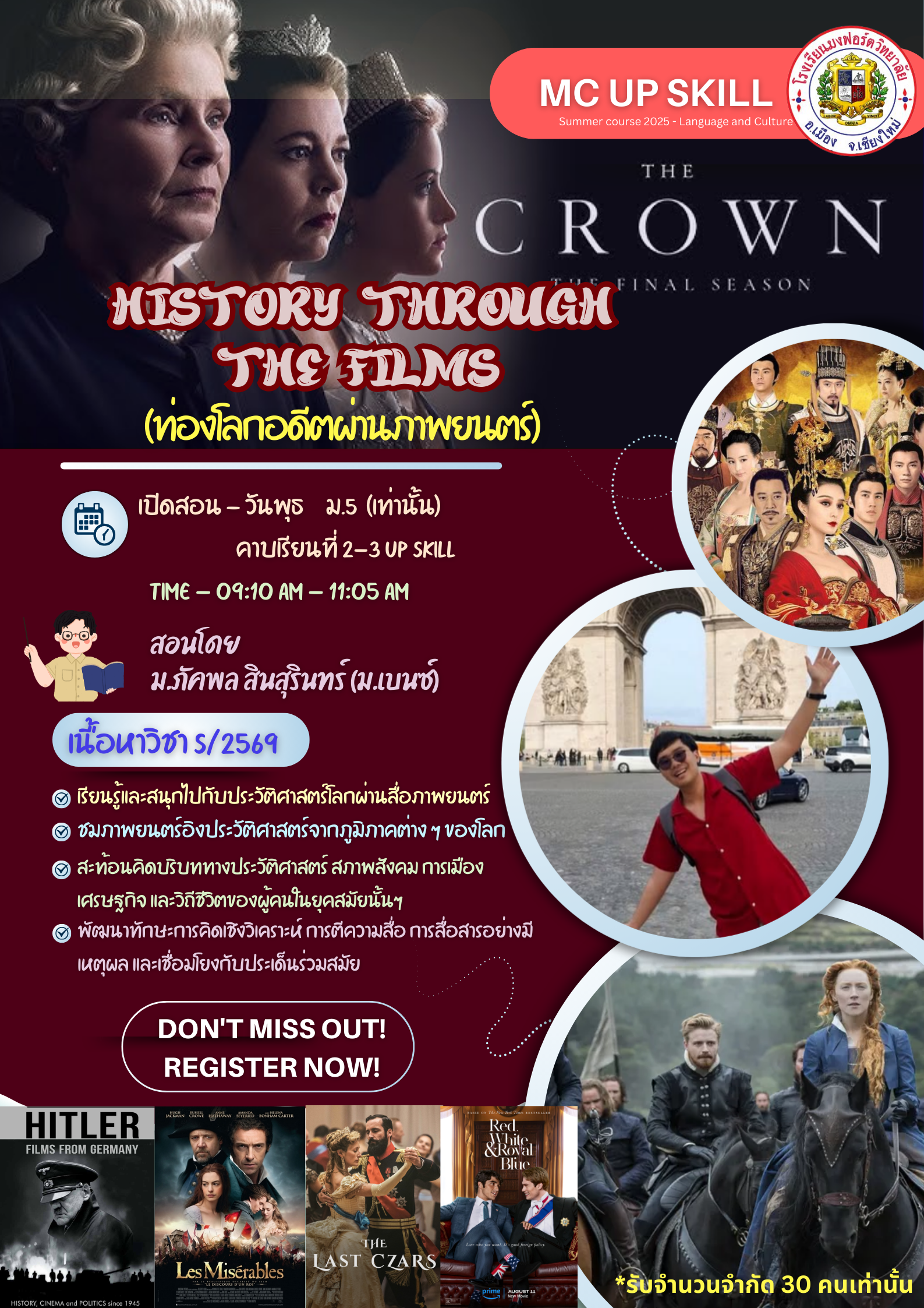 ชื่อวิชา : History through the Films (ท่องโลกอดีตผ่านภาพยนตร์กับ ม.เบนซ์) ครูผู้สอน : ภัคพล สินสุรินทร์ ระดับชั้นที่เปิดสอน : ม.5 ค่าใช้จ่าย : - ดูรายละเอียดเพิ่มเติม.. |